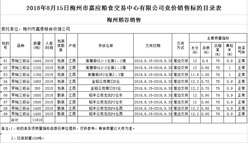 受客戶委托,梅州市嘉應(yīng)糧食交易中心有限公司定于2018年8月15日(星期三)舉辦糧食競價(jià)交易會,梅州市嘉泰糧食收儲公司擬銷售早秈稻11618噸。