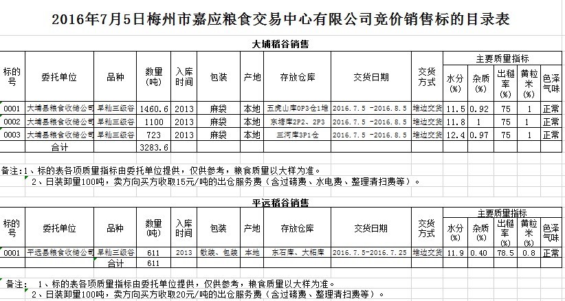 受客戶委托,梅州市嘉應(yīng)糧食交易中心有限公司定于2016年7月5日舉辦糧食競價(jià)交易會,大埔縣糧食收儲公司擬銷售2013年早秈稻谷3283.6噸,平遠(yuǎn)縣糧食收儲公司擬銷售2013年早秈稻谷611噸。