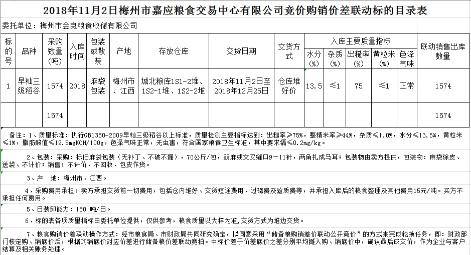 受客戶委托,梅州市嘉應(yīng)糧食交易中心有限公司定于2018年11月2日(星期五)舉辦稻谷購銷價(jià)差聯(lián)動(dòng)標(biāo)的交易會(huì),梅州市金良糧食收儲(chǔ)有限公司擬銷售和采購早秈稻1574噸。