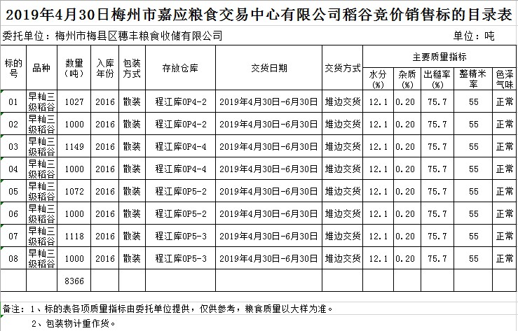 受客戶委托,梅州市嘉應(yīng)糧食交易中心有限公司定于2019年4月30日(星期二)舉辦糧食競價交易會,梅州市梅縣區(qū)穗豐糧食收儲有限公司擬銷售2016年早秈稻8366噸。