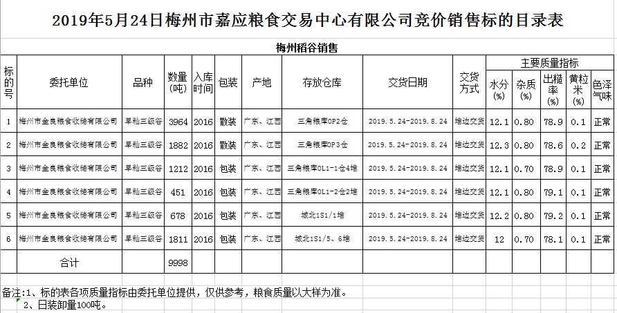 交易時間和地點(diǎn):2019年5月24日(星期五)上午10時10分。廣東省梅州市彬芳大道南161號梅州市糧食交易中心3樓。