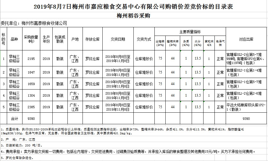 受客戶委托,梅州市嘉應(yīng)糧食交易中心有限公司定于2019年8月7日(星期三)舉辦稻谷購(gòu)銷(xiāo)價(jià)差聯(lián)動(dòng)標(biāo)的交易會(huì),梅州市嘉泰糧食收儲(chǔ)公司擬銷(xiāo)售和采購(gòu)早秈稻9390噸。