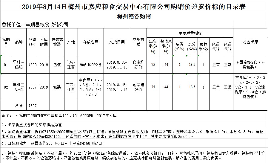 受客戶(hù)委托,梅州市嘉應(yīng)糧食交易中心有限公司定于2019年8月14日(星期三)舉辦稻谷購(gòu)銷(xiāo)價(jià)差聯(lián)動(dòng)標(biāo)的交易會(huì),豐順縣糧食收儲(chǔ)公司擬銷(xiāo)售和采購(gòu)早秈稻7307噸。