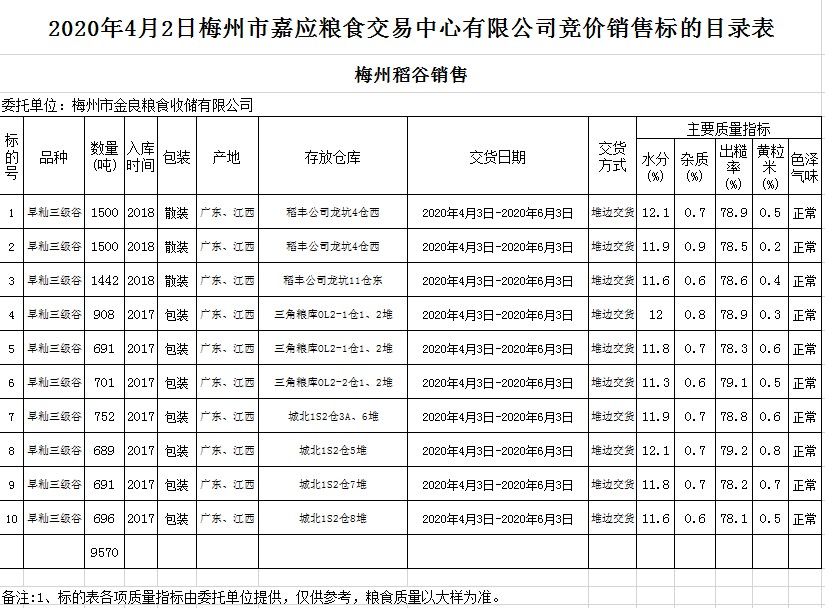 受客戶委托,梅州市嘉應(yīng)糧食交易中心有限公司定于2020年4月2日(星期四)舉辦糧食競(jìng)價(jià)交易會(huì),梅州市金良糧食收儲(chǔ)有限公司擬銷售2017年、2018年早秈稻9570噸。