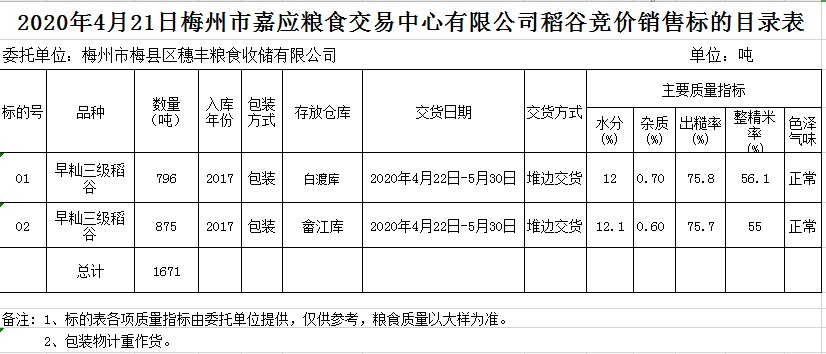 受客戶委托,梅州市嘉應(yīng)糧食交易中心有限公司定于2020年4月21日(星期二)舉辦糧食競價交易會,梅州市梅縣區(qū)穗豐糧食收儲有限公司擬銷售2017年早秈稻1671噸。