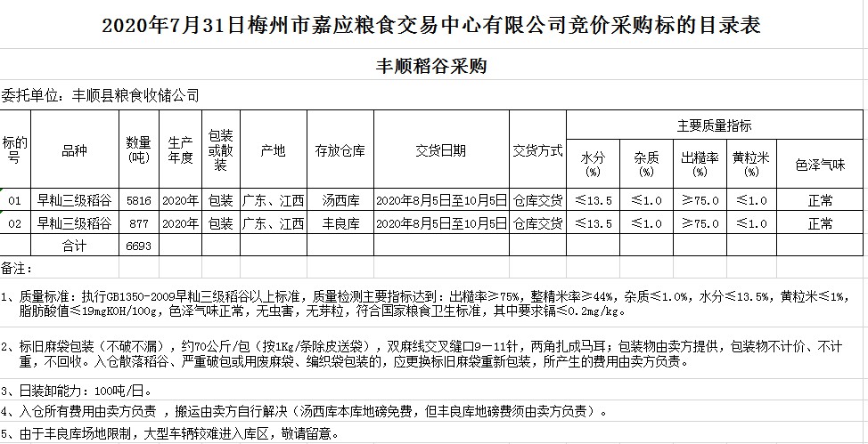 受客戶委托,梅州市嘉應(yīng)糧食交易中心有限公司定于2020年7月31日(星期五)舉辦糧食競價(jià)交易會(huì),豐順縣糧食收儲(chǔ)公司擬采購2020年早秈稻6693噸。
