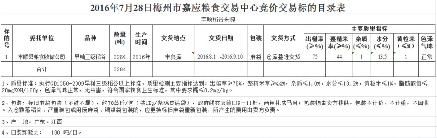 受客戶委托,梅州市嘉應(yīng)糧食交易中心有限公司定于2016年7月28日舉辦糧食競價交易會,豐順縣糧食收儲公司擬采購2016年產(chǎn)早秈三級稻谷2284噸。