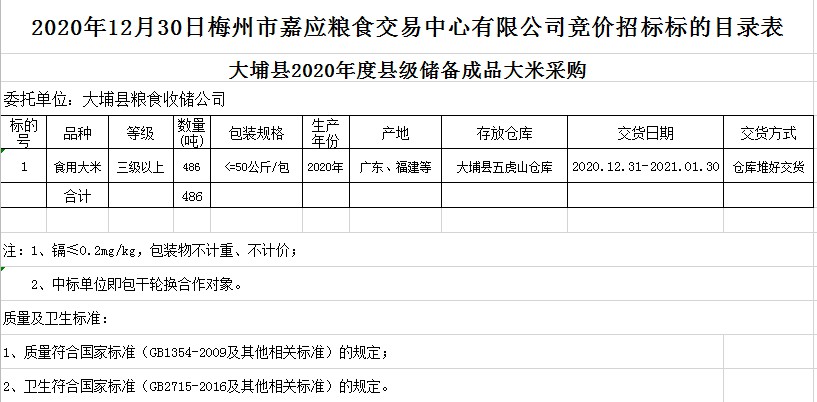 受客戶委托,梅州市嘉應(yīng)糧食交易中心有限公司定于2020年12月30日(星期三)上午10時(shí)在廣東省梅州市彬芳大道南161號(hào)梅州市糧食交易中心3樓,舉辦大埔縣縣級(jí)儲(chǔ)備成品糧采購公開招標(biāo)。