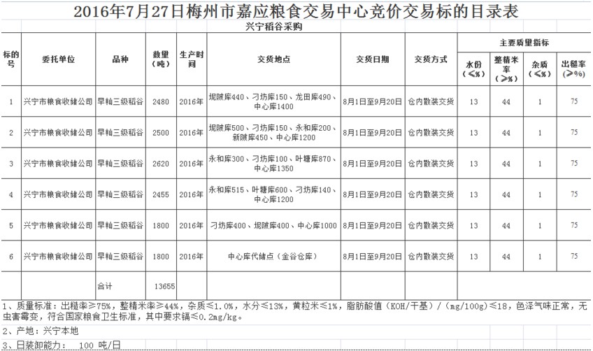 受客戶委托,梅州市嘉應(yīng)糧食交易中心有限公司定于2016年7月27日舉辦糧食競(jìng)價(jià)交易會(huì),興寧市糧食收儲(chǔ)公司擬采購(gòu)2016年產(chǎn) 興寧本地早秈三級(jí)稻谷13655噸。