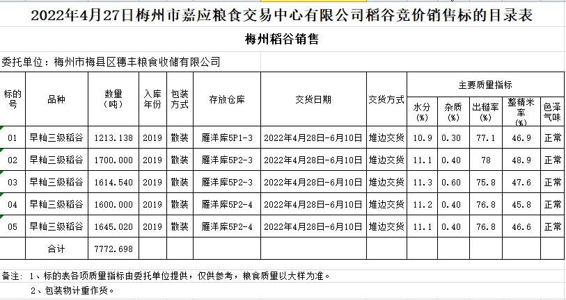 受客戶委托,梅州市嘉應(yīng)糧食交易中心有限公司定于2022年4月27日(星期三)舉辦糧食競價(jià)交易會(huì)。梅州市梅縣區(qū)穗豐糧食收儲有限公司擬銷售2019年早秈稻7772.698噸。