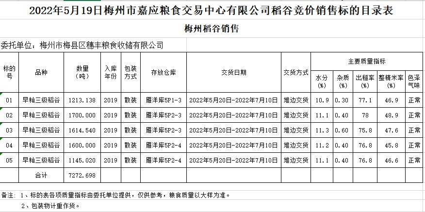 受客戶委托,梅州市嘉應(yīng)糧食交易中心有限公司定于2022年5月19日(星期四)舉辦糧食競(jìng)價(jià)交易會(huì)。梅州市梅縣區(qū)穗豐糧食收儲(chǔ)有限公司擬銷售2019年早秈稻7272.698噸。