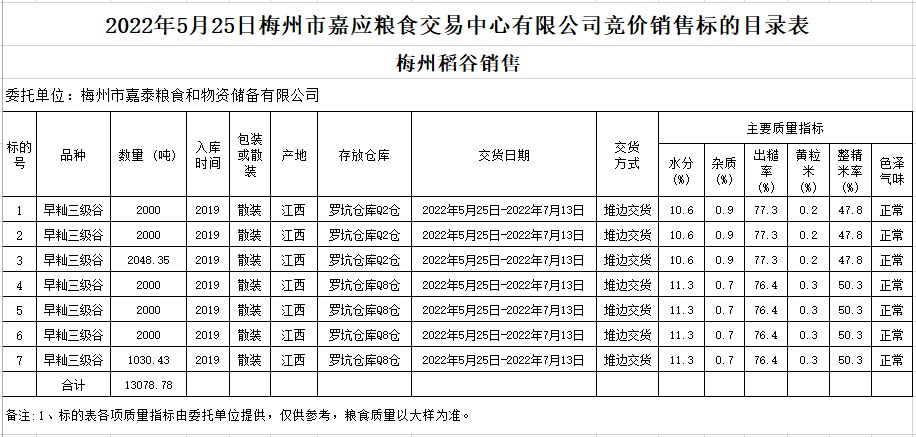 受客戶委托,梅州市嘉應(yīng)糧食交易中心有限公司定于2022年5月25日(星期三)舉辦糧食競價(jià)交易會。梅州市嘉泰糧食和物資儲備有限公司擬銷售2019年早秈稻13078.78噸。