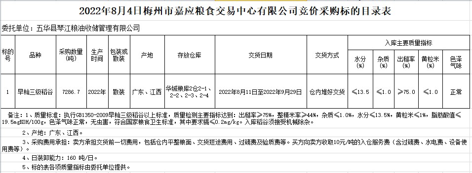 受客戶委托,梅州市嘉應(yīng)糧食交易中心有限公司定于2022年8月4日(星期四)舉辦糧食競價交易會。五華縣琴江糧油收儲管理有限公司擬采購2022年早秈稻7286.7噸。