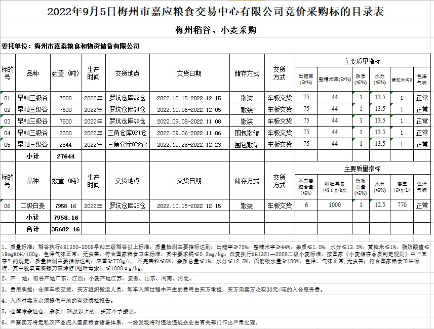 受客戶委托,梅州市嘉應(yīng)糧食交易中心有限公司定于2022年9月5日(星期一)舉辦糧食競(jìng)價(jià)交易會(huì)。梅州市嘉泰糧食和物資儲(chǔ)備有限公司擬采購2022年早秈稻27644噸、二級(jí)白麥7958.16噸。
