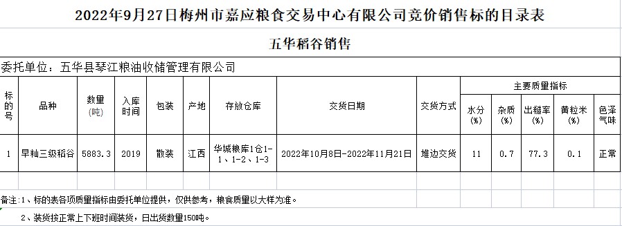 受客戶委托,梅州市嘉應糧食交易中心有限公司定于2022年9月27日(星期二)舉辦糧食競價交易會。五華縣琴江糧油收儲管理有限公司擬銷售2019年早秈稻5883.3噸。