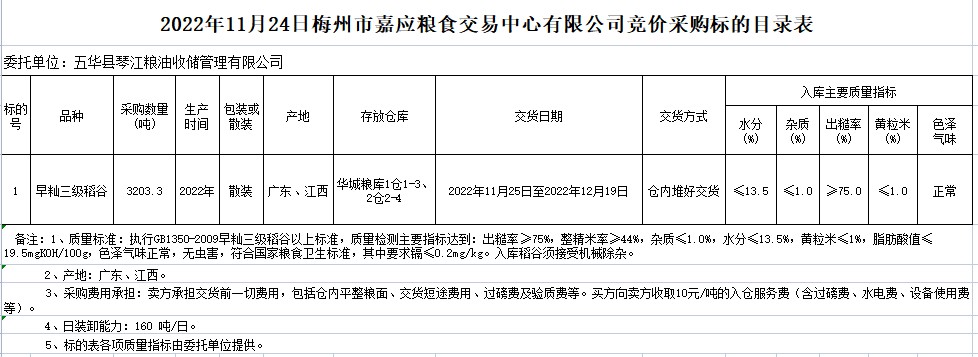 受客戶委托,梅州市嘉應(yīng)糧食交易中心有限公司定于2022年11月24日(星期四)舉辦糧食競價交易會。五華縣琴江糧油收儲管理有限公司擬采購2022年早秈稻3203.3噸。