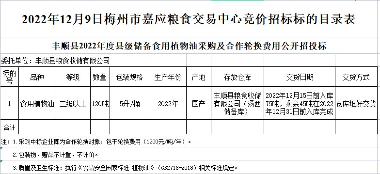 豐順縣2022年度縣級儲備食用植物油采購及合作輪換費用公開招投標公告