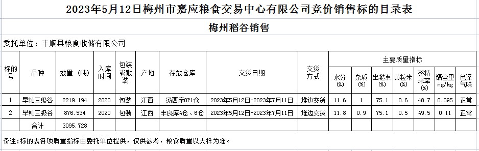 受客戶委托,梅州市嘉應糧食交易中心有限公司定于2023年5月12日(星期五)舉辦糧食競價交易會。豐順縣糧食收儲有限公司擬銷售2020年早秈稻3095.728噸。