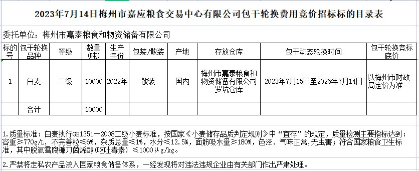 受客戶委托,梅州市嘉應(yīng)糧食交易中心有限公司定于2023年7月14日(星期五)上午10時15分在梅州市嘉應(yīng)糧食交易中心有限公司舉辦梅州市市級儲備糧小麥包干輪換(自主輪換)公開招標(biāo)。