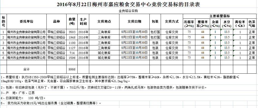 受客戶委托,梅州市嘉應(yīng)糧食交易中心有限公司定于2016年8月22日舉辦糧食競價(jià)交易會(huì),梅州市金良糧食收儲(chǔ)有限公司擬采購2016年產(chǎn)早秈三級稻谷9986噸。