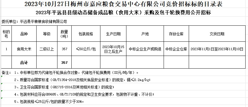 1、品種為食用大米,等級(jí)為二級(jí)(含二級(jí))以上,數(shù)量共計(jì)357噸(分1個(gè)標(biāo)的),包裝規(guī)格≤50公斤/包(其中包裝規(guī)格≤25公斤/包的數(shù)量不少于30%),包干輪換期限為二年。