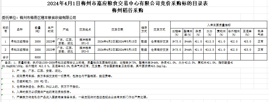 受客戶委托,梅州市嘉應(yīng)糧食交易中心有限公司定于2024年4月1日(星期一)舉辦糧食競(jìng)價(jià)交易會(huì)。梅州市梅縣區(qū)穗豐糧食收儲(chǔ)有限公司擬采購2023年產(chǎn)早秈稻6000噸。