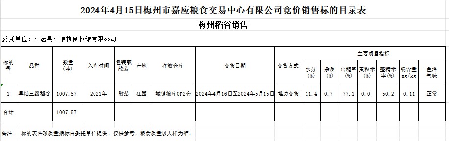 受客戶委托,梅州市嘉應(yīng)糧食交易中心有限公司定于2024年4月15日(星期一)舉辦糧食競價交易會。平遠縣平糧糧食收儲有限公司擬銷售2021年產(chǎn)早秈稻1007.57噸。
