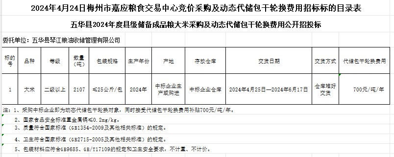 五華縣2024年度縣級(jí)儲(chǔ)備成品糧大米采購及動(dòng)態(tài)代儲(chǔ)包干輪換費(fèi)用公開招標(biāo)公告