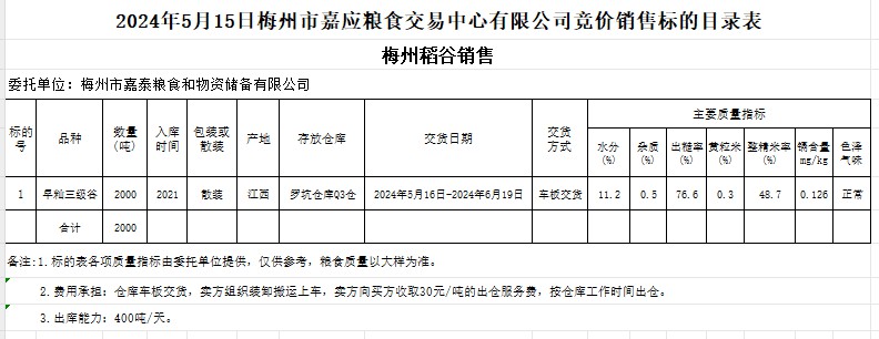 受客戶委托,梅州市嘉應(yīng)糧食交易中心有限公司定于2024年5月15日(星期三)舉辦糧食競(jìng)價(jià)交易會(huì)。梅州市嘉泰糧食和物資儲(chǔ)備有限公司擬銷(xiāo)售2021年產(chǎn)早秈稻2000噸。