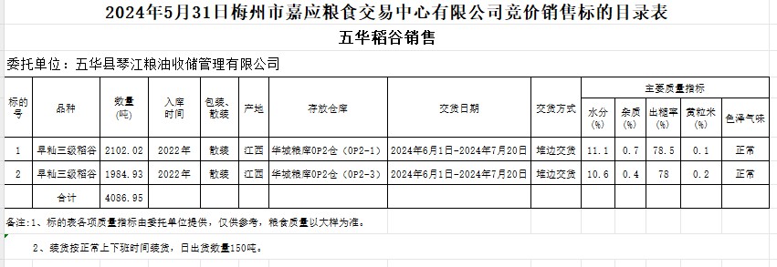 受客戶委托,梅州市嘉應(yīng)糧食交易中心有限公司定于2024年5月31日(星期五)舉辦糧食競(jìng)價(jià)交易會(huì)。五華縣琴江糧油收儲(chǔ)管理有限公司擬銷(xiāo)售2022年產(chǎn)早秈稻4086.95噸。
