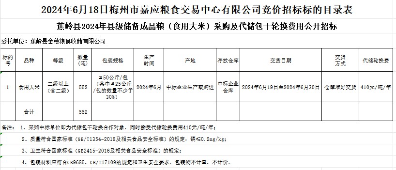 受客戶委托,梅州市嘉應糧食交易中心有限公司定于2024年6月18日(星期二)上午10時在廣東省梅州市彬芳大道南161號梅州市糧食交易中心3樓,舉辦蕉嶺縣2024年縣級儲備成品糧(食用大米)采購及代儲包干輪換費用公開招標。