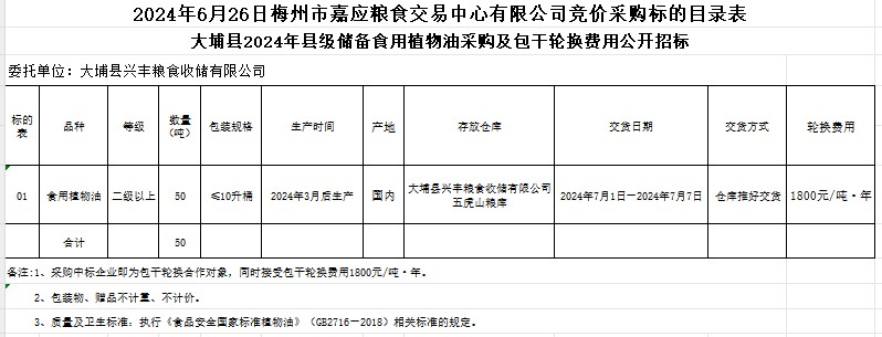 大埔縣2024年縣級儲備食用植物油采購及包干輪換費用公開招標(biāo)公告
