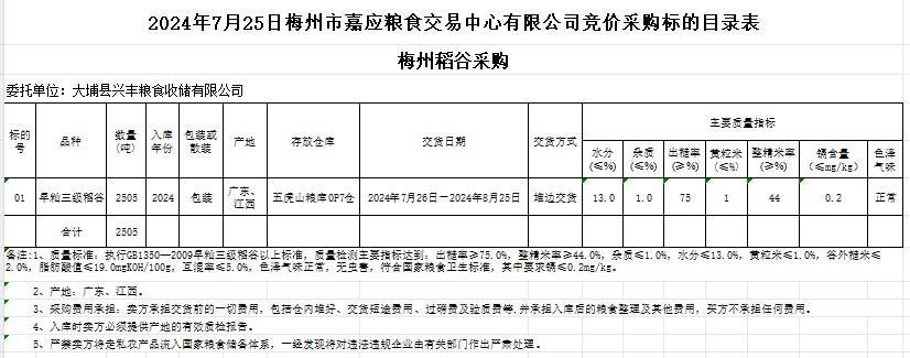 受客戶委托,梅州市嘉應糧食交易中心有限公司定于2024年7月25日(星期四)舉辦糧食競價交易會。大埔縣興豐糧食收儲有限公司擬采購2024年產(chǎn)早秈稻谷2505噸。