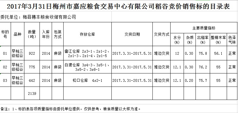 受客戶委托,梅州市嘉應(yīng)糧食交易中心有限公司定于2017年3月31日舉辦糧食競(jìng)價(jià)交易會(huì),梅州市梅縣區(qū)穗豐糧食收儲(chǔ)有限公司擬銷售早秈三級(jí)稻谷2139噸。