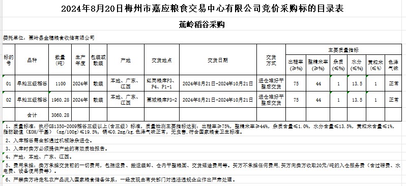 受客戶委托,梅州市嘉應(yīng)糧食交易中心有限公司定于2024年8月20日(星期二)舉辦糧食競價交易會。蕉嶺縣金穗糧食收儲有限公司擬采購2024年產(chǎn)早秈稻3060.28噸。