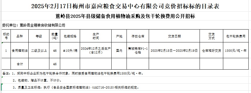 蕉嶺縣2025年縣級儲備食用植物油采購及包干輪換費(fèi)用公開招標(biāo)公告
