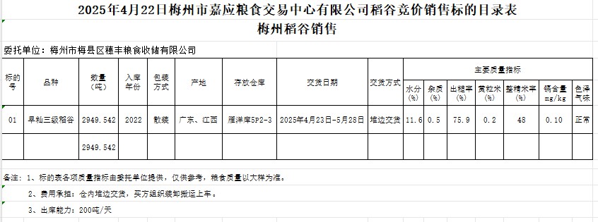 受客戶委托,梅州市嘉應(yīng)糧食交易中心有限公司定于2025年4月22日(星期二)舉辦糧食競價(jià)交易會。梅州市梅縣區(qū)穗豐糧食收儲有限公司擬銷售2022年產(chǎn)早秈稻谷2949.542噸。