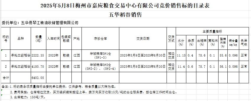 受客戶委托,梅州市嘉應(yīng)糧食交易中心有限公司定于2025年5月8日(星期四)舉辦糧食競(jìng)價(jià)交易會(huì)。五華縣琴江糧油收儲(chǔ)管理有限公司擬銷(xiāo)售2022年產(chǎn)早秈稻谷6403.05噸。