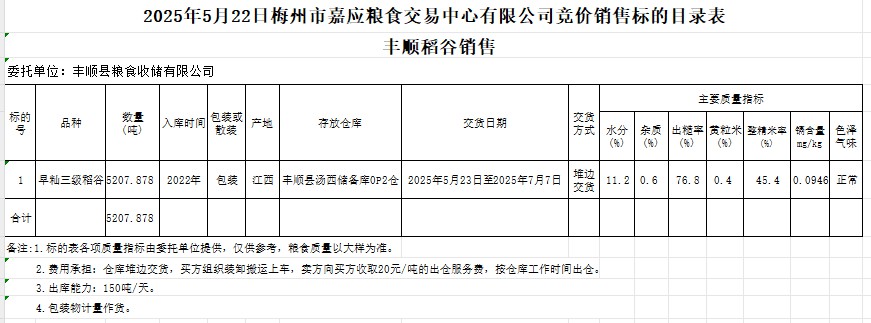受客戶委托,梅州市嘉應(yīng)糧食交易中心有限公司定于2025年5月22日(星期四)舉辦糧食競(jìng)價(jià)交易會(huì)。豐順縣糧食收儲(chǔ)有限公司擬銷售2022年產(chǎn)早秈稻谷5207.878噸。