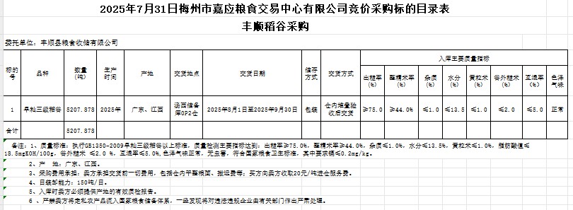 受客戶(hù)委托,梅州市嘉應(yīng)糧食交易中心有限公司定于2025年7月31日(星期四)舉辦糧食競(jìng)價(jià)交易會(huì)。豐順縣糧食收儲(chǔ)有限公司擬采購(gòu)2025年產(chǎn)早秈稻谷5207.878噸。