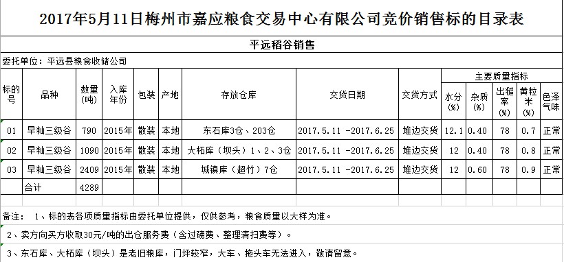 受客戶委托,梅州市嘉應(yīng)糧食交易中心有限公司定于2017年5月11日舉辦糧食競價交易會,平遠(yuǎn)縣糧食收儲公司擬銷售2015年早秈三級稻谷4289噸。