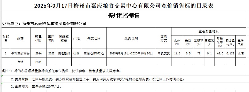 受客戶委托,梅州市嘉應(yīng)糧食交易中心有限公司定于2025年9月17日(星期三)舉辦糧食競(jìng)價(jià)交易會(huì)。梅州市嘉泰糧食和物資儲(chǔ)備有限公司擬銷(xiāo)售2022年產(chǎn)早秈稻谷2844噸。