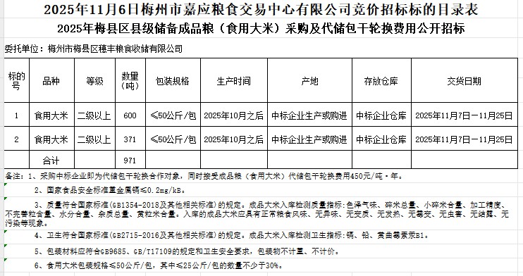 梅縣區(qū)2025年縣級(jí)儲(chǔ)備成品糧(食用大米)采購(gòu)及代儲(chǔ)包干輪換費(fèi)用公開(kāi)招標(biāo)公告