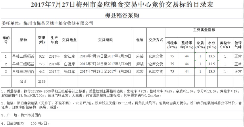 受客戶委托,梅州市嘉應(yīng)糧食交易中心有限公司定于2017年7月27日舉辦糧食競(jìng)價(jià)交易會(huì),梅州市梅縣區(qū)穗豐糧食收儲(chǔ)有限公司擬采購(gòu)2017年早秈三級(jí)稻谷共2139噸。