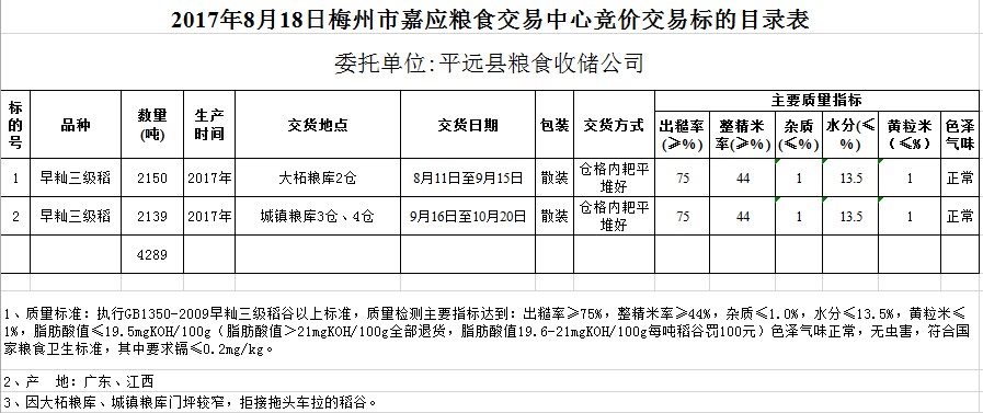受客戶委托,梅州市嘉應(yīng)糧食交易中心有限公司定于2017年8月18日舉辦糧食競(jìng)價(jià)交易會(huì),平遠(yuǎn)縣糧食收儲(chǔ)公司擬采購(gòu)2017年早秈三級(jí)稻谷共4289噸。
