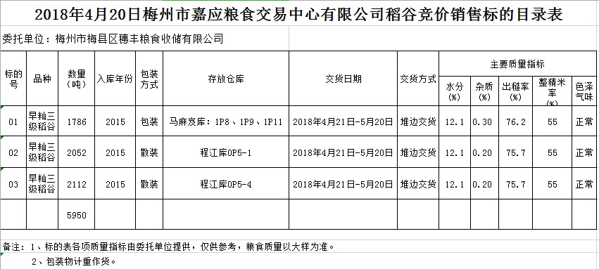 受客戶委托,梅州市嘉應(yīng)糧食交易中心有限公司定于2018年4月20日(星期五)舉辦糧食競(jìng)價(jià)交易會(huì),梅州市梅縣區(qū)穗豐糧食收儲(chǔ)有限公司擬銷售早秈稻5950噸。